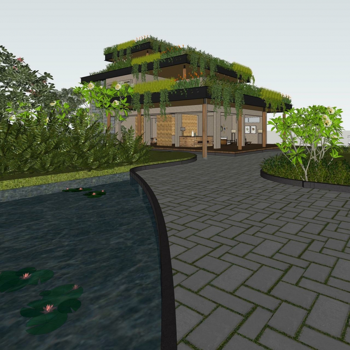 An after render- of what could be. An existing building of storage facilities below and two bedroom living quarters above will be opened up revealing the frame structure. Large decks will extend out, emphasised by deep metal beams and enlivened with vegetation- creating a play of horizontals which will ground this building to its site and provide a series of multi functional terraces above; where one can take in the views of the farm.