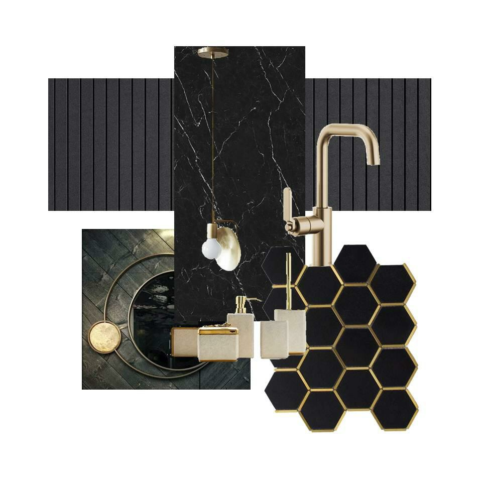 A mood board for a new and exciting, apartment, toilet design, where we are excited to try out a dark palette.