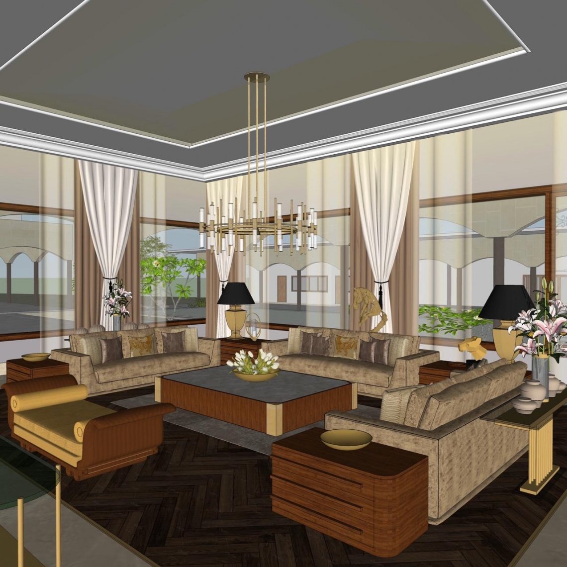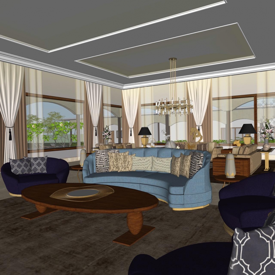 Farm House Great Room, on Kanakapura Road, Bangalore. With Art Deco influenced furniture, warm colour tones, rich fabrics and drapes and venetian plastered walls we have tried to achieve a striking balance between opulence and eclecticism. Taking in vistas of the pool and outhouse beyond, the plush interiors are contrasted with traditional and rustic estate architecture.