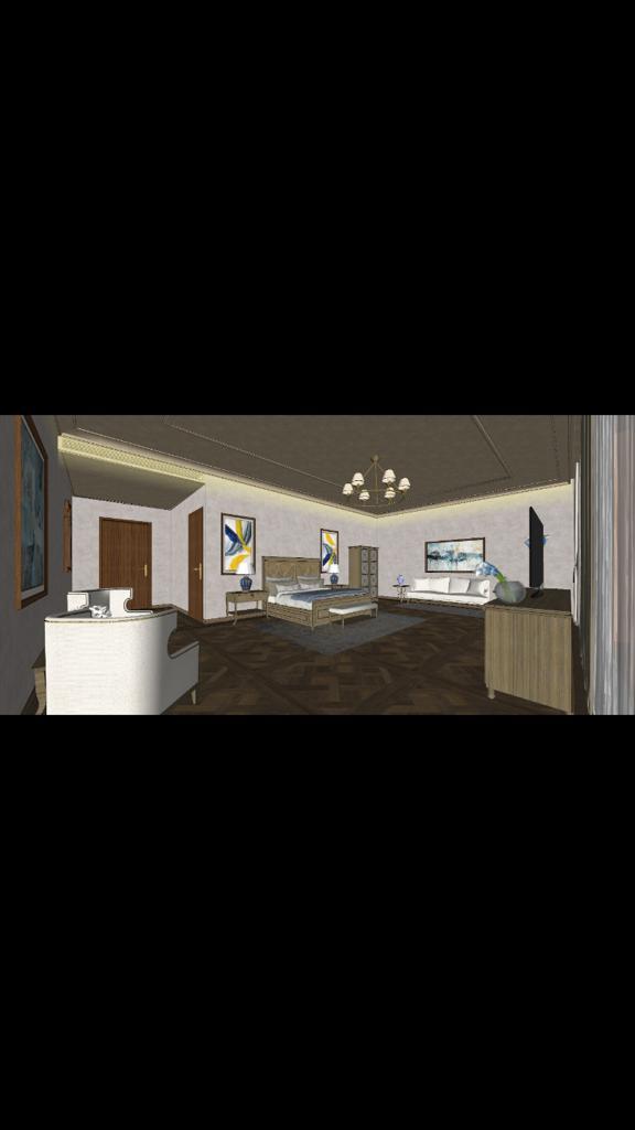Modelled with Bernhardt inspired furniture; a SoHo luxe vibe, this farmhouse bedroom serves as a perfect mélange of East meets West. The European inspired Versailles Parquet floors are the perfect juxtaposition to the Oriental Accent Elements.