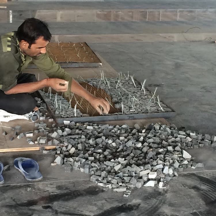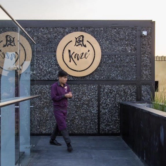Gabions are baskets of galvanised steel wire filled with interlocking individual stones and rocks. They are economical and environment friendly as recycled materials can be placed into the gabion cage. Kaze features a decorative gabion element that allows light to pass through the gaps between the stones, making it an attractive feature wall to the restaurant.--