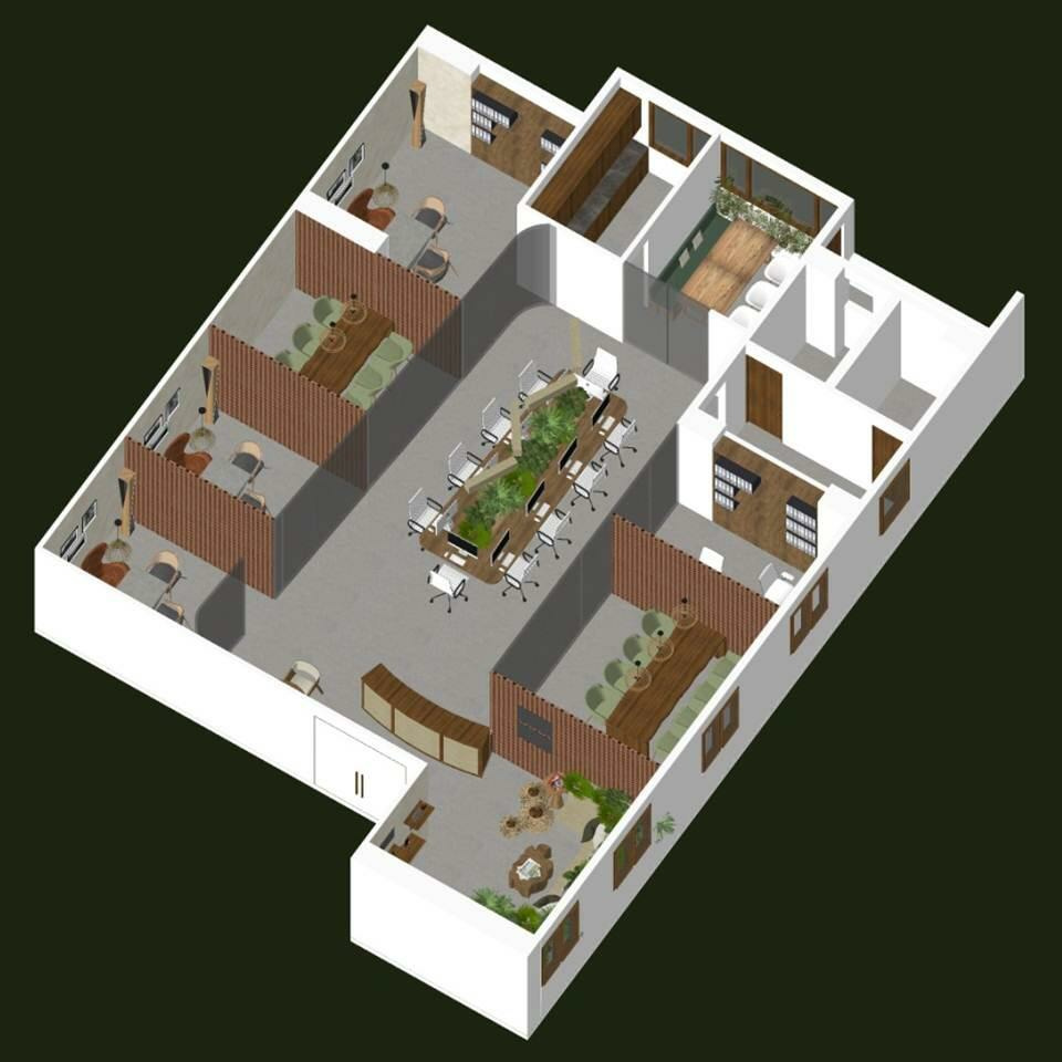 An axonometric view of a new office project for Hosachiguru-a company that does, Managed Farmlands, with a very natural and raw material palette.