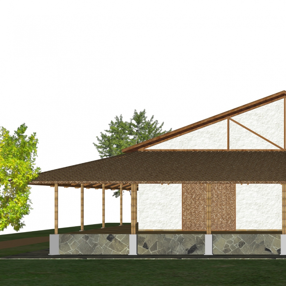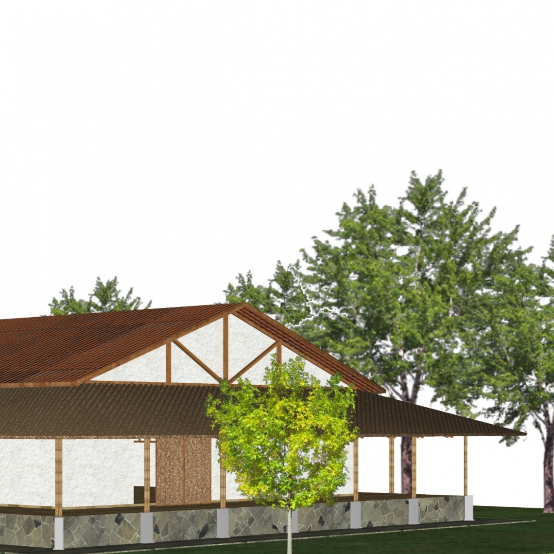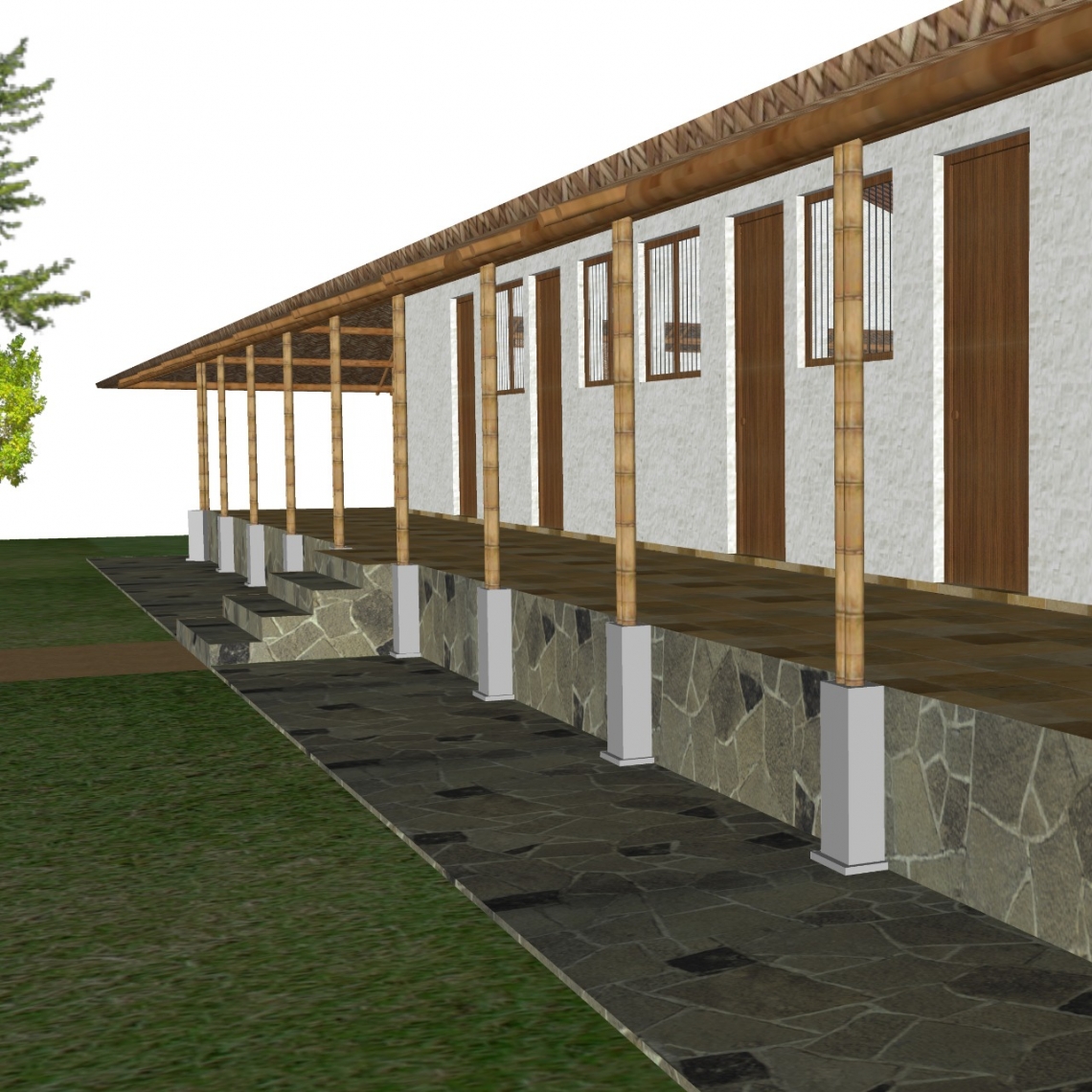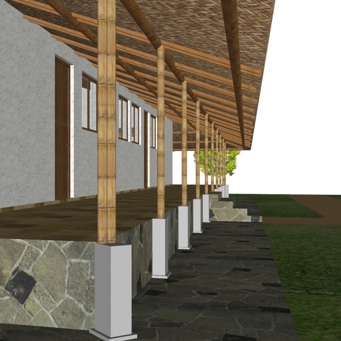 Designed with local materials & building techniques. Rough plastered walls sub-divide the interior spaces and our topped by an open Mangalore tile gable roof. A six foot wide verandah is sheltered by a casuarina structure complete with woven thatch. Woven screens act as blinds or loose partitions to provide privacy.