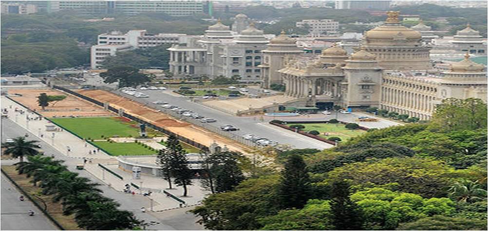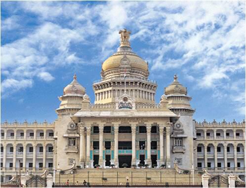 The Vidhana Soudha is the seat of the state legislature in Karnataka and serves a symbol of heritage and democratic landmark . The structure itself is neo Dravidian with influences of classical European and Indo - Saracenic styles. The building is four storeyed with a central dome that rises 55m above ground.