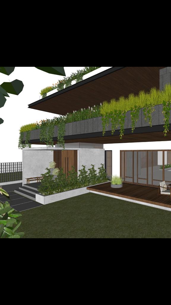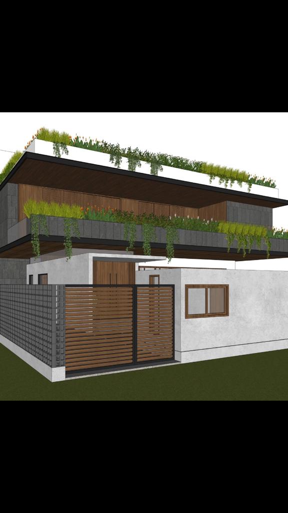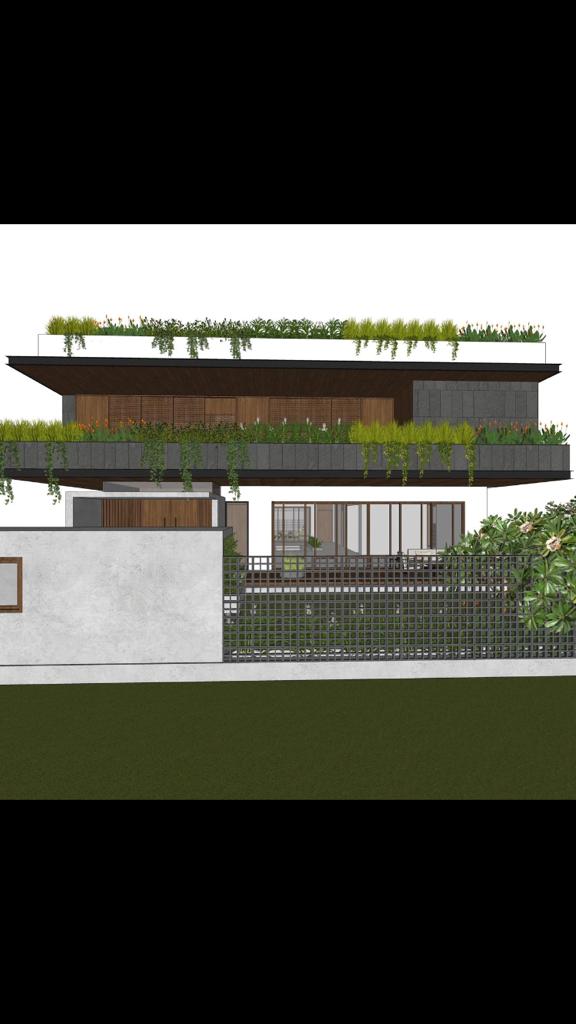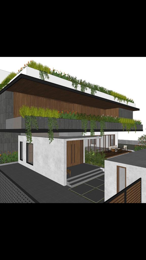 Designed for a lawyer on a large site in Bangalore, the structure hunkers down in its plot allowing vegetation to carefully grow over its looming form. A careful selection of materials, basalt cladding, rich oak veneer, form finished concrete and ISMCs give it a simple, bold and structural importance. The brief consists of varied, yet direct functions; smart planning and green solutions help to deliver this with a most humane form. Each element stands for its necessity, pure, balanced and controlled by the rest, it is given a rich materiality that will eventually be mellowed with greenery. Clean lines, warm colours and bold character are softened with plants, creepers and low tress. A series of courtyards, balconies and open verandas allow light and shade to dance within this seemingly hollow shell. While inside, forthright planning and interiors of scale harmoniously envelope the exterior in a play of landscaped planters, perched just over the edge so they can grow inside and hush over outside. This house aims to be a result of perfect planning deriving form maturing through a green, but almost mobiusly rigid facade.