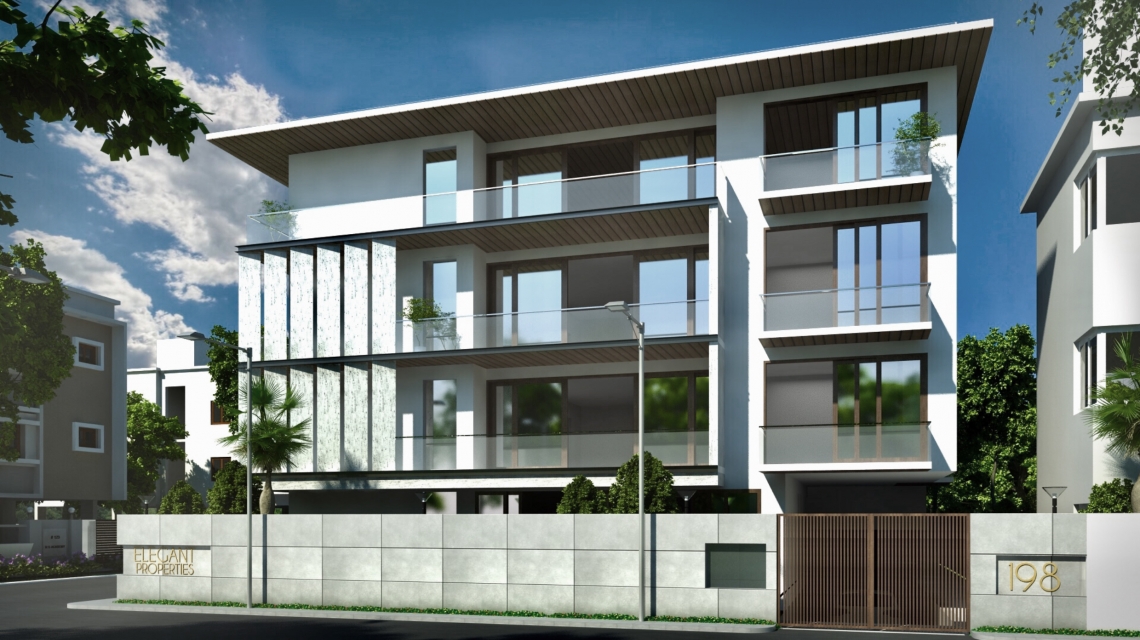 Description: Located in an upscale and residential part of Indiranagar, the clients were looking for an effecient floor plate which allows for a simple, clean and elegant facade solution. The facade consists of Slim stone fins over two floors act as a thermal barrier and further allows privacy for the lower floors. In terms of design language, the screen emphasizes the corner while unifying the massing