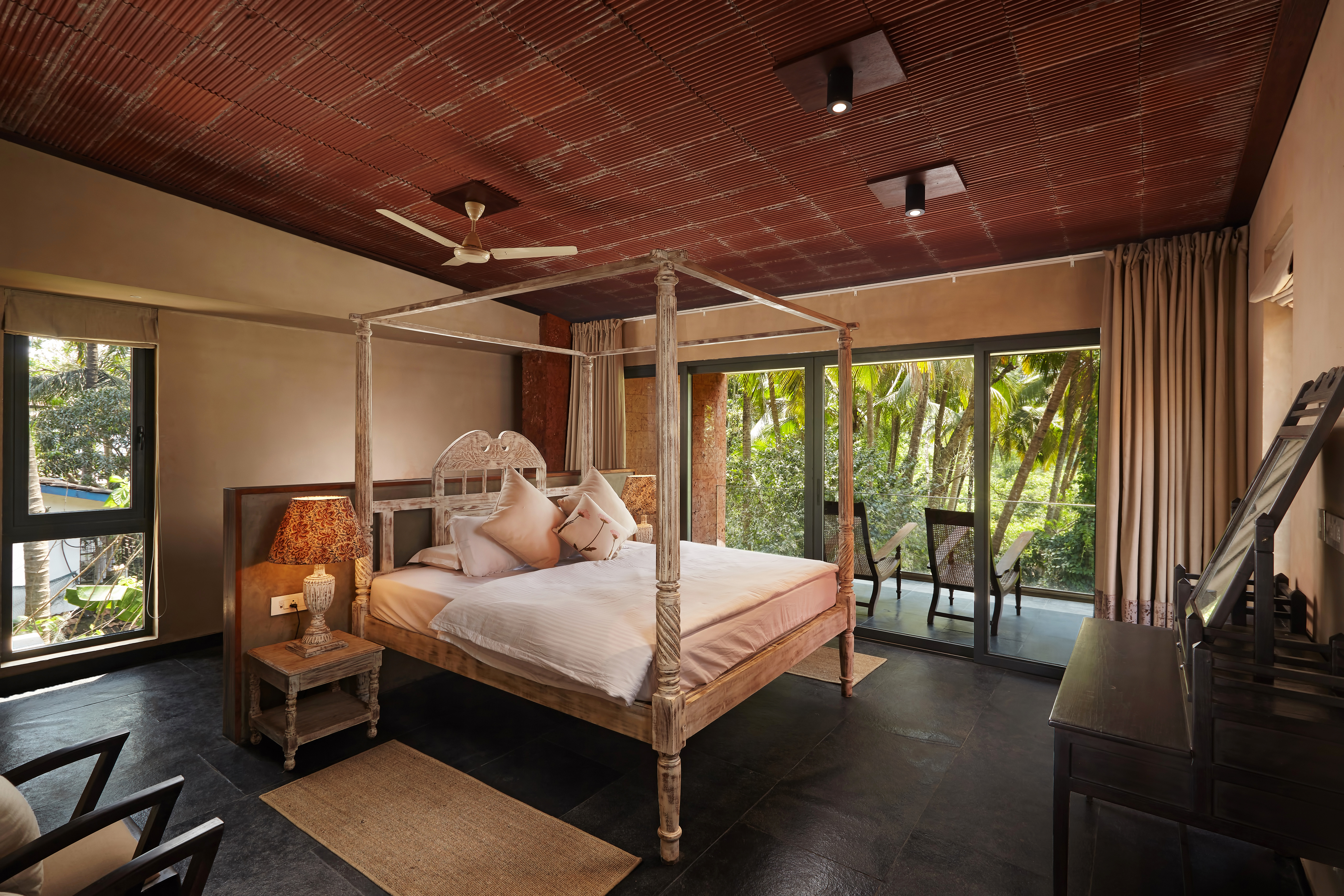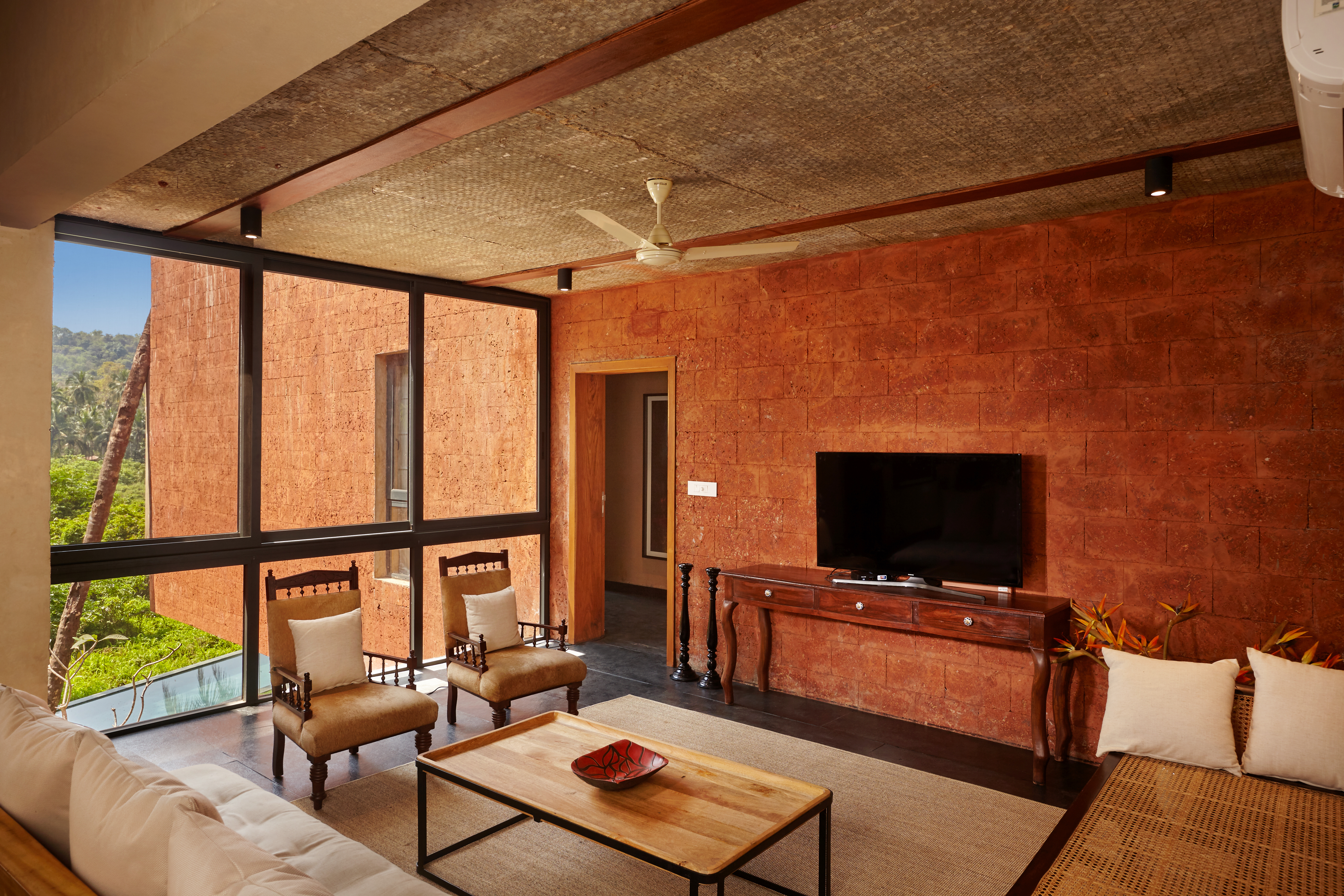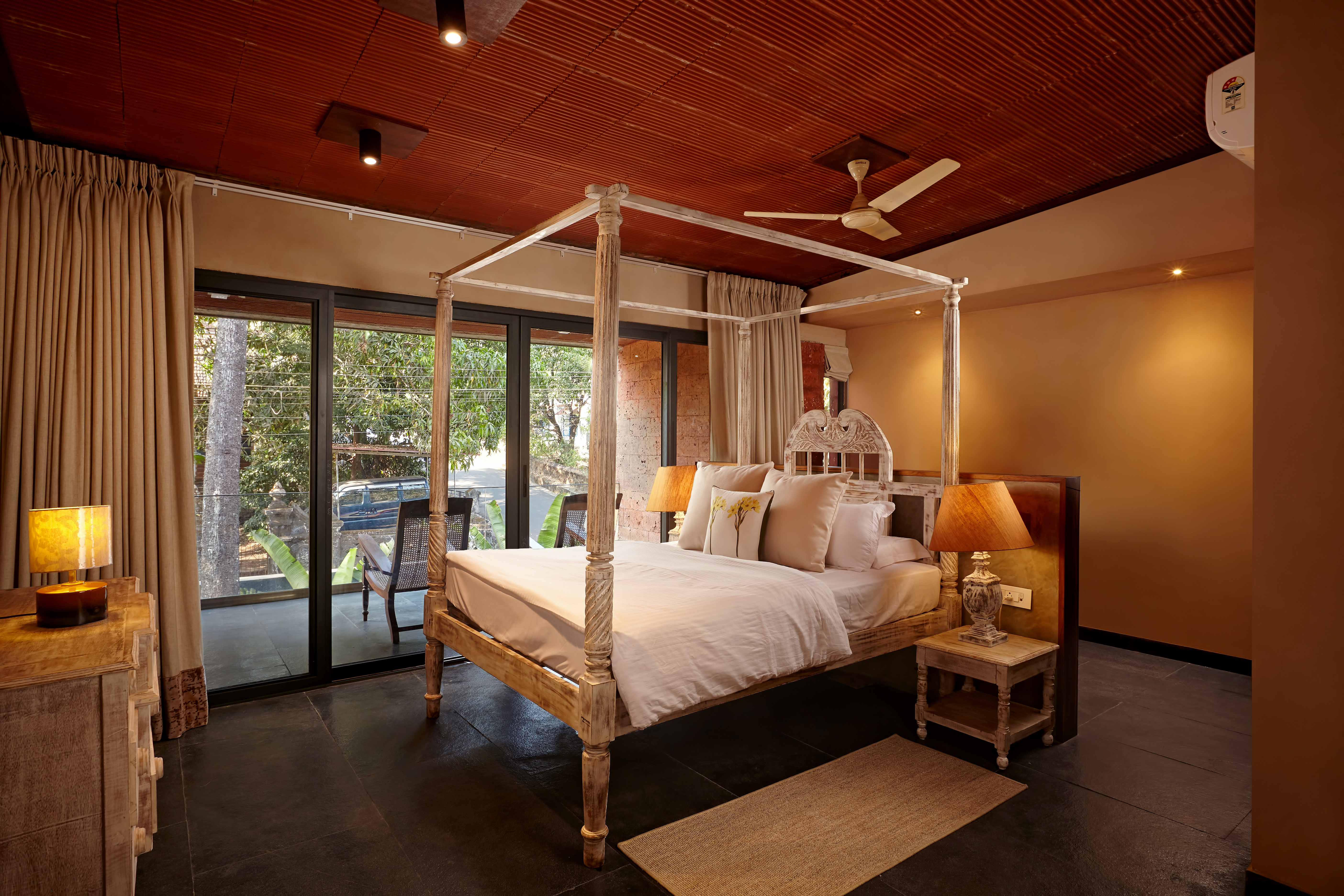 Levitating House gets its name from the seemingly floating volume of the Villa and stretches out towards the rear green fields. It is designed to heighten the experience of a get-away home meant for both relaxation and entertainment, built to cater to the requirements of the discerning inhabitants. The spaces are organised such that the living, lounging, entertaining and eating spaces all open out into the backyard with the pool as this space inherits the tropical landscape and hill in the horizon and connects the house visually with it. Two of the upper floor bedrooms look into this tropical expanse as well. Through the use of locally sourced laterite, Goan pigmented cement tiles, and local skilled craft like polished pigmented concrete flooring, the Villa harmonises with the environment and imbibes qualities of the Goan tradition.